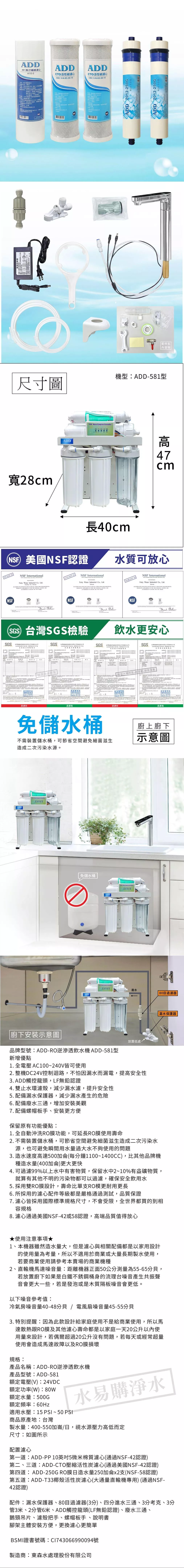 ADD-581 生飲級家用RO淨水器|無桶直輸型|全機NSF認證濾心 水易購 新竹+竹北店|通過BSMI商檢認證