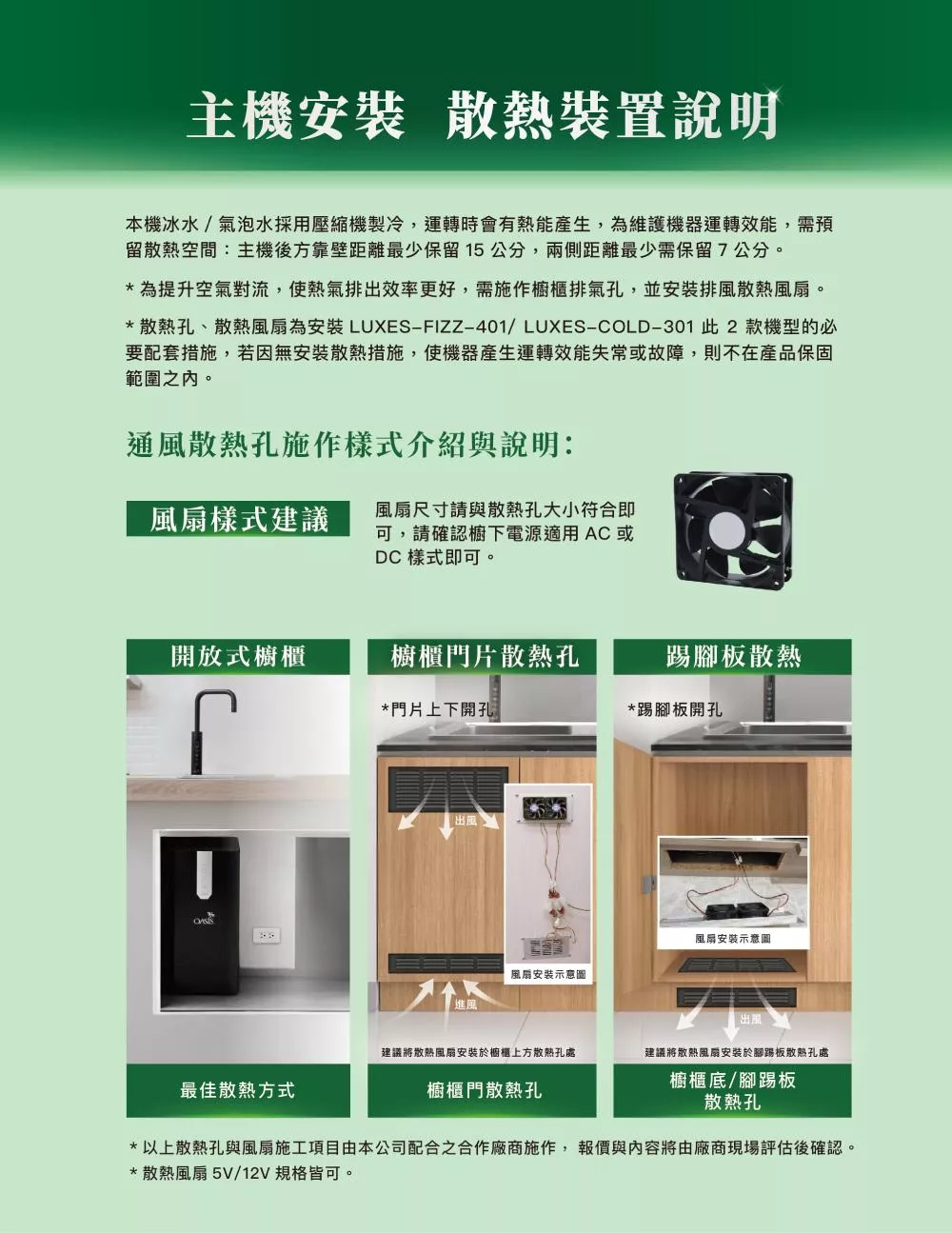 - ※本機採用壓縮機製冷,建議於安裝的櫥櫃加開上下散熱孔,保持空氣對流以確保最佳運作狀態。